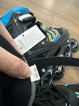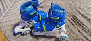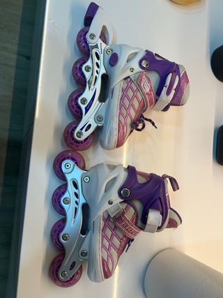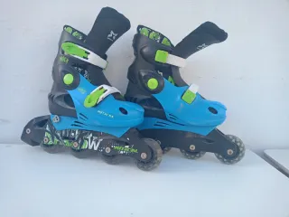 Patines en linea con luces en las ruedas(al movimiento). Talla S(pone de 31 a 34,pero en España sería equivalente de 28 a 30). Talla ajustable. Comprados en Amazon (ver imagen).