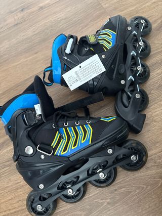 Se venden patines en línea en color negro con detalles en azul. Son cómodos y seguros. Talla de la 31 a 34 - Diseño moderno. - Cierre de velcro y hebilla. - Ruedas resistentes.