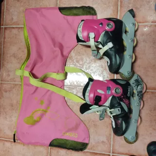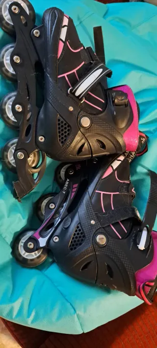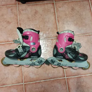 Se venden patines en línea de color rosa y blanco. Se encuentra en Alcudia, Mallorca. - Diseño ajustable para mayor comodidad. - Cierre de velcro y hebilla para un ajuste seguro. - Ruedas resistentes para un deslizamiento suave. Ruedas de luces. Talla del 33 al 36.