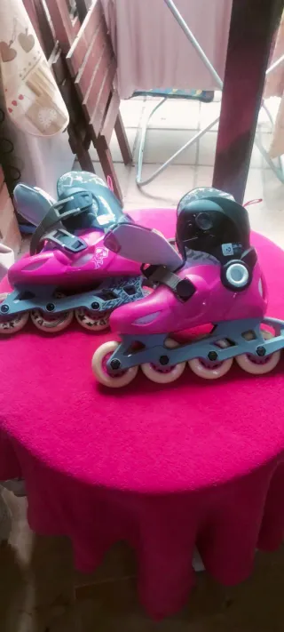 Patines en línea de color rosa, ideales para deslizarse con estilo. Cuentan con luces que se activan al rodar. Talla extensible de la 32 a 35 Se regalan conos. Aunque el velero de las sujeción se ha soltado como se aprecia en las fotos, se entregará arreglado. Si te lo quedas te regalo casco.