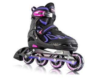 Se venden patines en línea con un diseño moderno y llamativo. - Ruedas con luces LED integradas. - Cierre de velcro y hebilla para un ajuste seguro. - Diseño en color negro con detalles en morado y rosa.