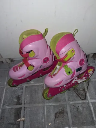 Patines en línea para niña, talla adaptable del 35 al 37. Incluye práctica bolsa de transporte. Están en buen estado, con algunos signos normales de uso. - Dos patines en línea. - Bolsa de transporte a juego. - Talla ajustable.