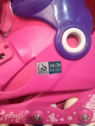 Patines en línea para niña, marca Play, talla 30-32. - Color rosa y morado. - 4 ruedas. - Sistema de cierre con hebilla y velcro.