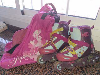 Patines en línea para niñas, en muy buen estado. Ideales para principiantes. Incluye dos patines y un juego de protecciones (rodilleras, coderas y muñequeras). - Patines en línea ajustables. - Diseño con flores. - Protecciones acolchadas. venta solo en persona