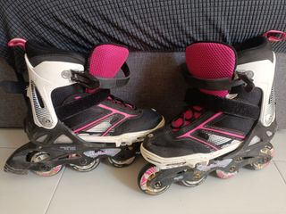 Patines en línea para niñas, en buen estado. Ideales para principiantes. - Talla 35-38 (22-24). - Color rosa y negro. - Incluye dos protecciones para rodillas y codos.