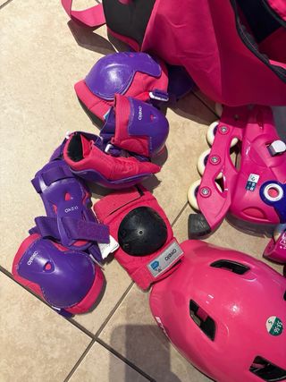 Patines Oxelo infantiles, ideales para niñas. Están en buen estado y listos para usar. - Incluye dos patines en línea, casco y protecciones (rodilleras, coderas y muñequeras). - Talla de los patines: 30-32. - Color rosa y morado. - Se entrega con bolsa de transporte Oxelo.