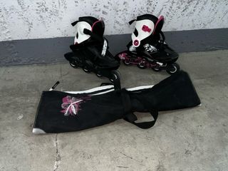 Se venden patines en línea para niño/niña, talla ajustable de 35 a 38, con un diseño en blanco, negro y rosa. Incluyen una bolsa de deporte azul con el logo de Nike. - Patines ajustables en talla 35-38. - Diseño deportivo en blanco, negro y rosa. - Bolsa de deporte Nike incluida.