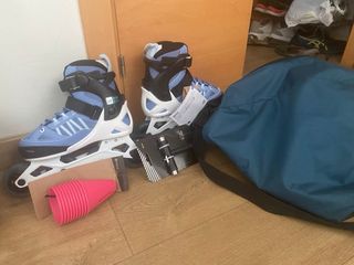Patines en línea Decathlon para niña, en buen estado. Ideales para iniciarse en el patinaje. - Color azul y blanco. - Talla (a determinar según la foto). - Incluye protecciones para las rodillas y los codos (2 pares). - Se incluye llave multiherramienta para ajustar los patines.