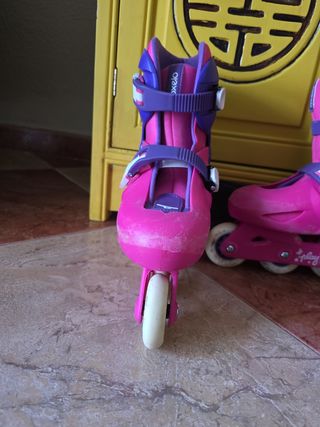 Patines en línea para niña, marca Play3, talla 32-34. Están en buen estado, con algunos signos de uso. - Modelo Play3. - Talla 32-34. - Color rosa y morado. - Incluyen dos patines.
