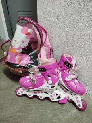 Patines en línea infantiles Hello Kitty, ideales para principiantes. Están en buen estado y son de color rosa y blanco. - Diseño con Hello Kitty. - Talla ajustable. - 2 patines incluidos.