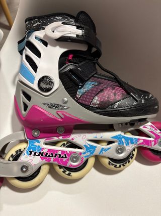 Patines en línea para niña de la marca Tijuana. Son ajustables desde la talla 35-38. - Color negro, blanco y rosa. - Cierre de velcro y hebilla. - Incluye bolsa y protecciones.
