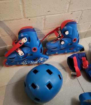 Patines en línea para niñ@s, en buen estado. Incluye dos patines y un juego completo de protecciones (rodilleras, coderas y muñequeras). También se incluye una bolsa de transporte azul. - Patines en línea ajustables. - Protecciones en buen estado. - Bolsa de transporte incluida.