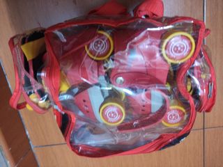 Set de patines en línea para niños, con un diseño llamativo en rojo y amarillo. - Incluye bolsa de transporte transparente. - Ruedas con luces. - Talla ajustable.