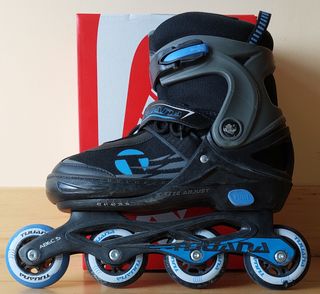 Patines en línea extensibles de la marca RUNFIT, ideales para niños y adolescentes. El diseño es ajustable para adaptarse al crecimiento. - Color azul y negro. - Ruedas de poliuretano. - Cierre de velcro y hebilla. TALLA 31-34, tienen muy poco uso están prácticamente nuevos,con su caja original Comprados en el corte inglés