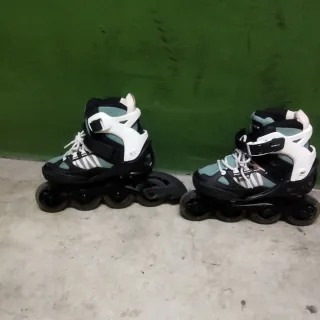 Talla ajustable 35–38 (22–23,5 cm), ideales para niños o adolescentes en crecimiento. Características: Bota semirrígida cómoda y estable Cierre seguro con hebilla, correa y cordones Ruedas 70 mm con poco desgaste Rodamientos ABEC 3 Freno trasero incluido Funcionan perfectamente, sin roturas ni grietas. Siempre usados de forma recreativa.
