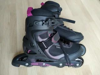 Vendo patines en línea Oxelo Active Fit 3 para mujer en color negro con detalles en rosa fucsia. Estéticamente están impecables y funcionan a la perfección. Detalles clave: Estado: Usados solo una vez (literalmente). Las ruedas de 76 mm y el taco de freno están prácticamente nuevos, sin desgaste. Comodidad: Bota "Fit" semi-flexible con malla ventilada, muy cómodos desde el primer momento. Sujeción perfecta: Triple cierre (cordones, tira de velcro y hebilla de ajuste) para máxima seguridad en el tobillo. Nivel: Ideales para principiantes o paseos recreativos por su gran estabilidad y rodamientos ABEC 3.