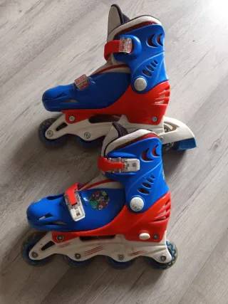 Se venden patines en línea para niños, con un diseño llamativo en color rojo y azul. - Ruedas de goma. - Cierre de velcro y hebilla. - Base blanca.