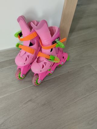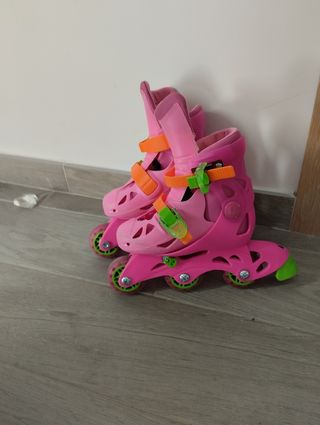 Patines en línea infantiles, ideales para niñas. Están en muy buen estado y son de color rosa fucsia con detalles en turquesa. Ruedas en buen estado.
