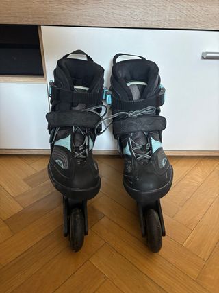 Patines en línea de color negro con detalles en azul. - Talla 38. - Cierre con cordones y correa. - Ruedas de patinaje en línea.