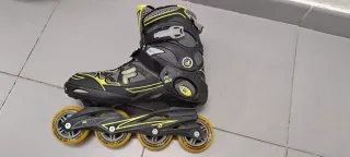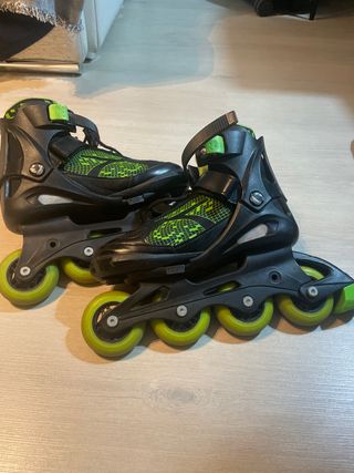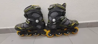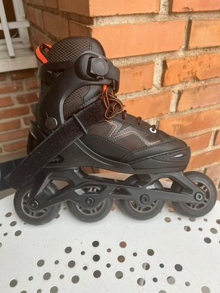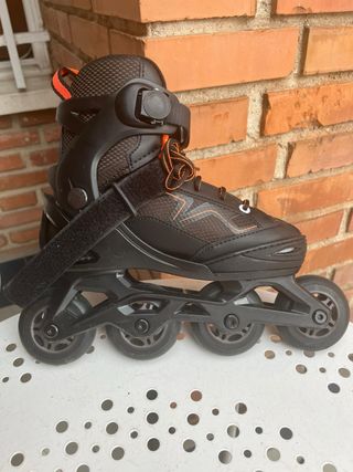 Patines en línea en buen estado, casi nuevos. Ideales para principiantes. - Color negro con detalles naranjas. - Sistema de cierre con hebilla y velcro. - Ruedas de tamaño estándar. - Talla ajustable para mayor comodidad.