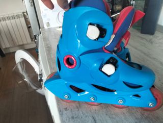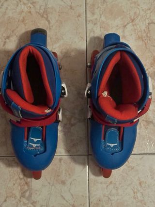 Se venden patines en línea de color azul brillante con detalles en rojo. Son perfectos para iniciarse en el patinaje. - Talla ajustable 28-30. - Cierre con velcro y hebilla. - Ruedas de poliuretano.