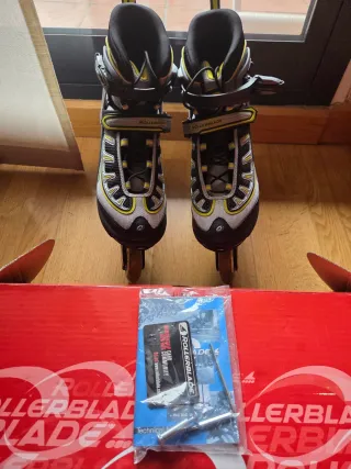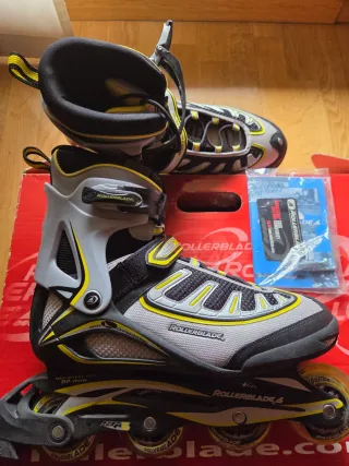 Se venden patines en línea Rollerblade en buen estado. Ideales para disfrutar del patinaje. Talla 43 europa - Marca: Rollerblade - Tamaño máximo de rueda: 80 mm - Diseño en gris, negro y amarillo
