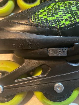 Patines en línea extensibles, ideales para niños y jóvenes. - Talla ajustable de 36 a 39. - Diseño en color negro con detalles en verde. - Ruedas de color verde brillante.
