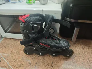 Patines en línea de la marca Tijuana, con un diseño moderno en color negro y detalles en rojo. - Cierre de hebilla y velcro. - Ruedas de alta resistencia. - Diseño deportivo. Comprados en el corte inglés talla 40