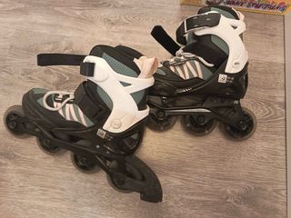 Patines en línea Oxelo en color negro, blanco y verde menta. impecables, usados una vez en pista interior. - Talla 38-41. - Cierre con cordones y velcro. - Ruedas FITS JUNIOR. precio decathlon 59,99