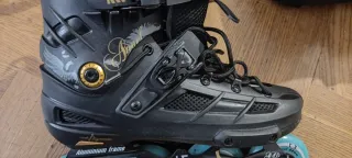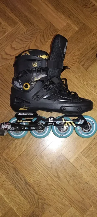 Patines en línea KRF Ángel, diseñados para ofrecer estilo y rendimiento. - Diseño en color negro con detalles dorados. - Cierre de carraca y velcro para un ajuste seguro. - Ruedas de poliuretano para un deslizamiento suave. - Marco de aluminio resistente. Lo entrego con dos juegos de ruedas, unas blandas para calle y las de serie. También otro juego de rodamientos y protecciones.