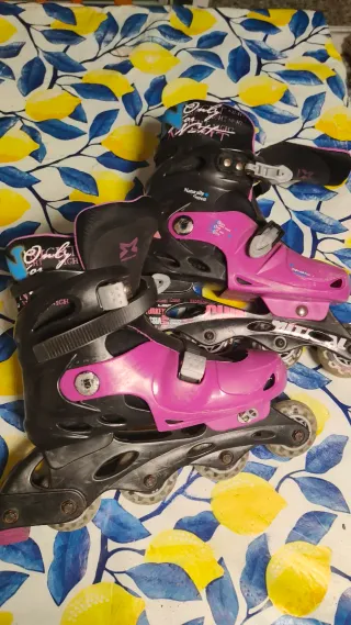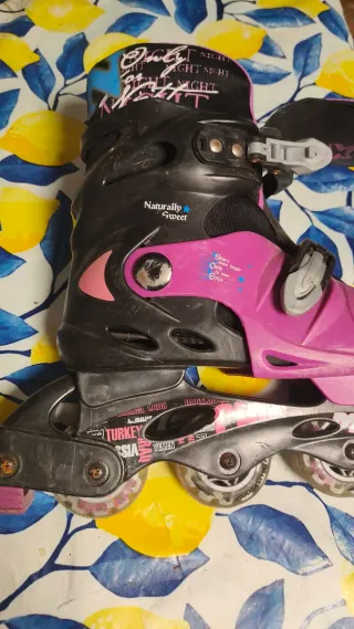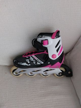 Patines en línea con un diseño llamativo en color rosa y negro. - Ruedas de poliuretano. - Cierre de velcro y hebilla. - Bota acolchada para mayor comodidad. - Son extensibles: talla 39-42 Es un producto de segunda mano: tiene las señales normales de uso pero está en buen estado. Hago envíos. Mira mis valoraciones.