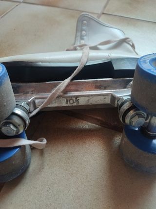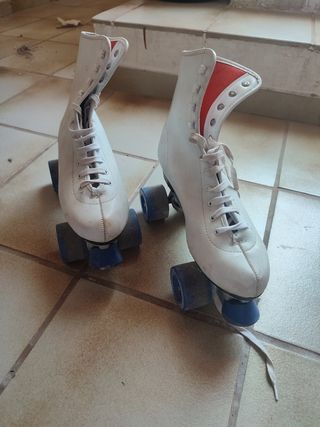 Patines en línea de cuatro ruedas, talla 10,5. Son de color blanco y tienen detalles en rojo y azul. Están en buen estado, aunque muestran señales normales de uso. - Marca: Roller - Talla: 10,5 - Color: Blanco con ruedas azulesl -