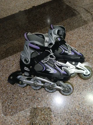 Patines en línea con un diseño llamativo en morado, blanco, gris y negro. - Estensibles de la talla 33 a la 36 - Cierre con cordones y cintas. - Ruedas de patinaje. - Marca Bollinger.