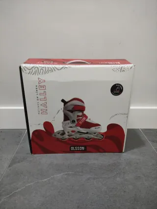 Patines en línea marca HALLEY de OLSSON, diseñados para patinaje. - Color rojo y blanco. - Cierre de velcro y hebilla. - Ruedas de patinaje.