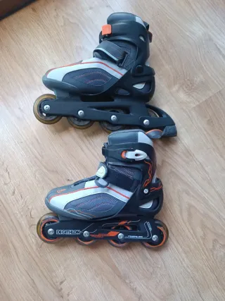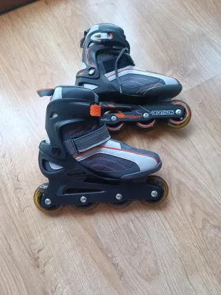 Patines en línea en talla 38, casi sin uso. - Diseño en gris, negro y naranja. - Cierre con velcro y hebilla. - Ruedas de poliuretano.
