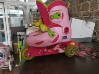 Patines de nina en linea en buen estado. Tienen rozones normales del uso pero están bien. Las ruedas se pueden cambiar en línea o paralelas para aprender.