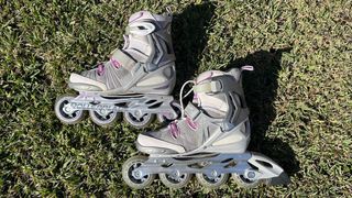 Se venden patines en línea de la marca Fila. - Color blanco con detalles en gris y rosa. - Cierre de velcro y cordones. - Ruedas de poliuretano.