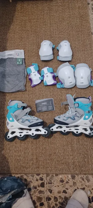 Patines en línea Oxelo para niña, se los ha puesto 2 veces, como mucho 20 min de uso... No tienen ningún desperfecto. Son del 15/01/25. Si es necesario, puedo adjuntar el ticket. - Ajustables del 30 al 32 - Color verde menta y blanco. - Estampado de árboles en el cuello. - Cierre de velcro y hebilla. - Ruedas de color rosa pálido. - Regalo protecciones. Están usadas, pero sirven.