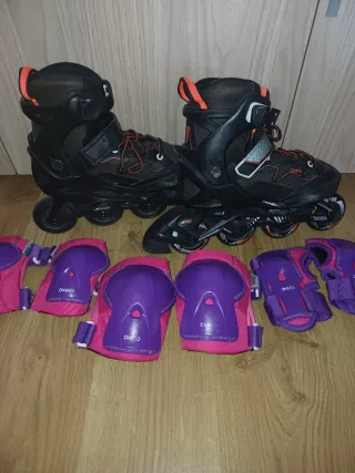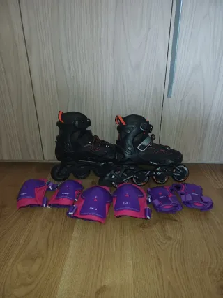 Set de patines en línea con protecciones. - Patines negros con detalles naranjas. - Incluye rodilleras, coderas y muñequeras. - Protecciones de color rosa y morado. - Precio no negociable. - Hay qur venir a buscarlos.