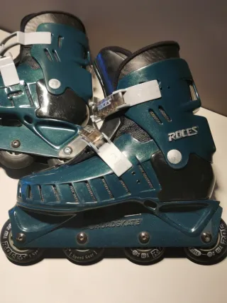 Se venden patines en línea de la marca Roces, en color verde azulado con detalles en blanco. N. 40 - Diseño robusto y moderno. - Cierres de hebilla y velcro. - Ruedas de patinaje en línea.