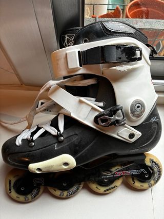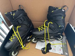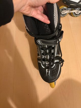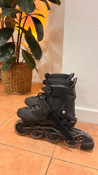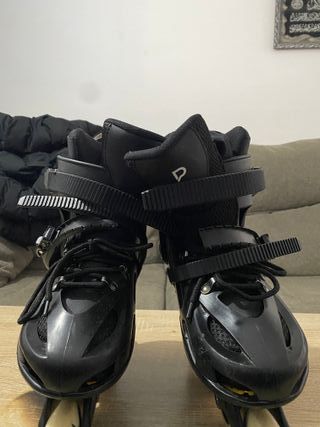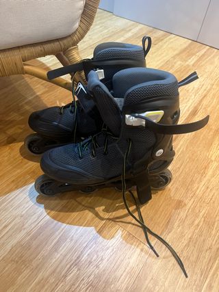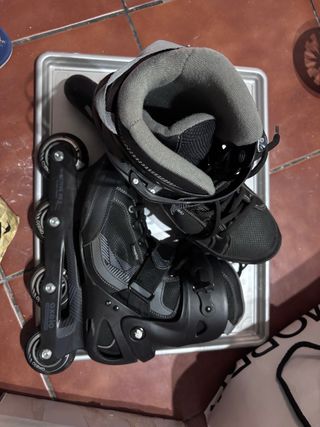 Se venden patines en línea de color negro, talla 45. Usados solo dos veces - Cierre con cordones, velcro y hebilla. - Ruedas de poliuretano. - Chasis de aluminio.