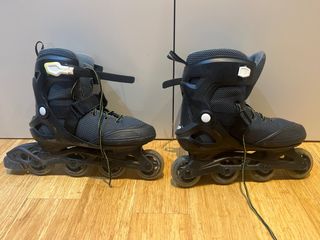 Patines en línea de la marca Oxelo en color negro. - Diseño deportivo. - Cierre con cordones y hebilla. - Ruedas alineadas. -Tienen algún rasguño pero puestos pocas veces. -Incluyo protecciones de muñecas. -Precio no negociable.