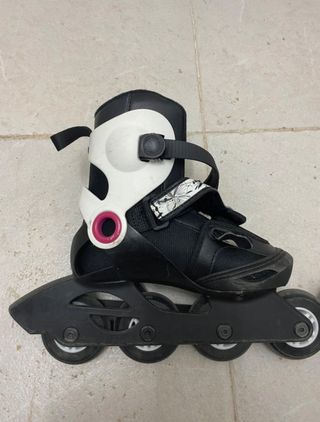 Patines en línea con un diseño moderno en color negro y blanco. Número 33 - Ruedas de alta resistencia. - Cierre de velcro y hebilla. - Detalle de color rosa en el lateral.