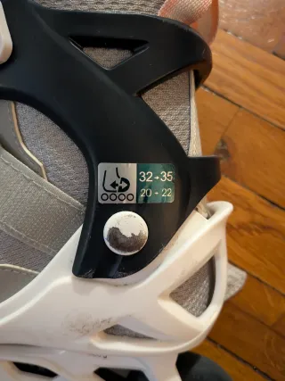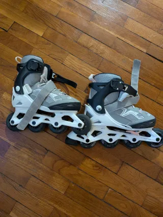 Patines en línea Oxelo para niños, ajustables en talla. - Talla ajustable de 32 a 35. - Diseño en color gris y blanco. - Cierre de velcro y hebilla.
