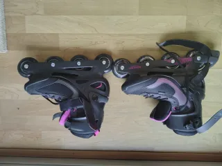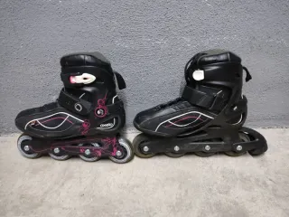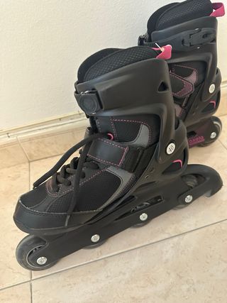 Patines en línea de la marca Rollerblade con cuatro ruedas. Talle extensible del 33 al 36.5 sin el freno - Color principal: negro y rosa. - Cierre con velcro y cordones. - Ruedas de 4 unidades.