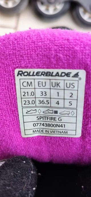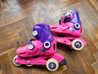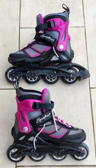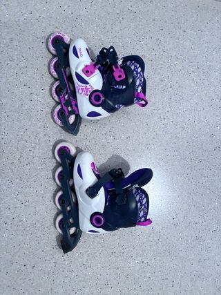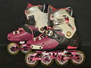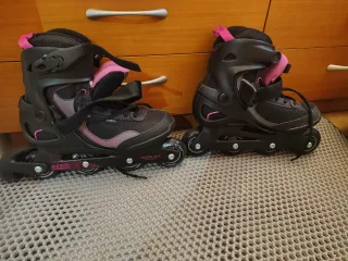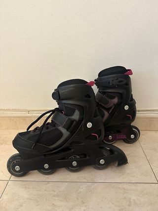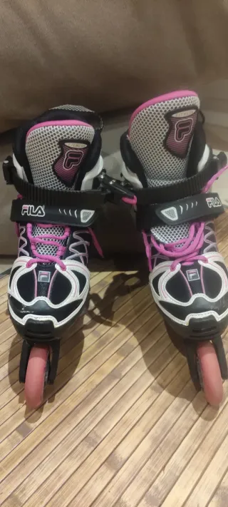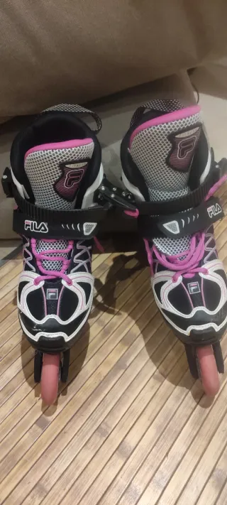 Patines en línea de la marca Fila, con alguna rascada pero buen estado general. - Talla ajustable de 32 a 35. - Diseño deportivo en negro, blanco y rosa. - Cierre de velcro y cordones para un ajuste seguro.