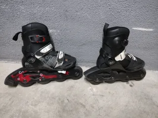 Patines en línea Oxelo con talla regulable, perfectos para acompañar el crecimiento de los pies. - Talla ajustable de la 32 a la 35. - Diseño en color negro con detalles en rojo. - Cierre con hebilla, velcro y cordones para un ajuste seguro.