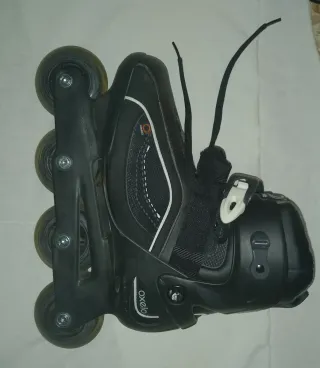 Patines en línea Oxelo de color negro, ideales para desplazamientos y ocio. - Diseño deportivo y moderno. - Cierre de velcro y cordones para un ajuste seguro. - Ruedas resistentes para un deslizamiento suave.