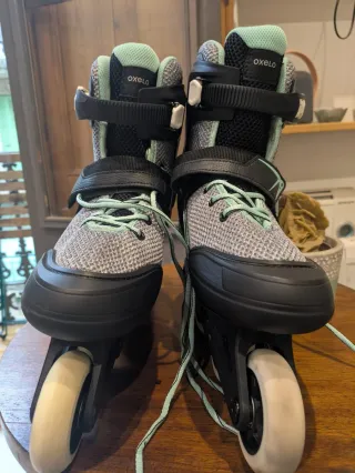 Set de patines en línea Oxelo de color menta, talla 34-36. Incluye protecciones para rodillas, codos y muñecas en excelente estado - Patines con ruedas y frenos. - Diseño ajustable. - Protecciones con cierre de velcro.