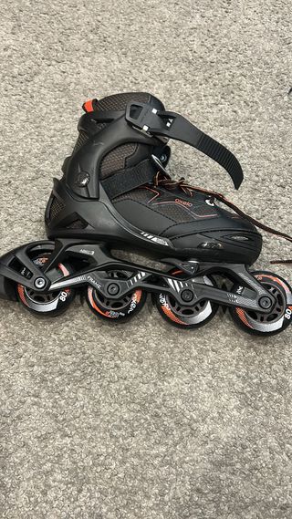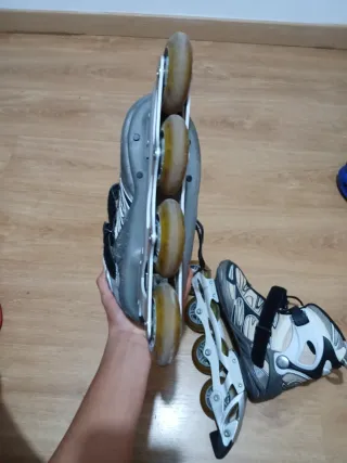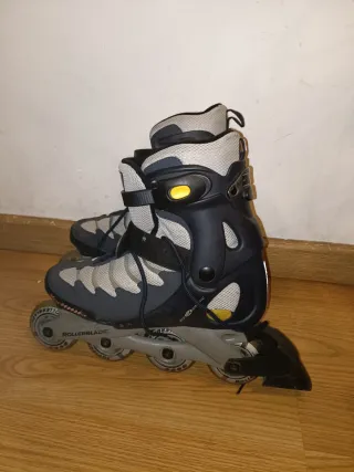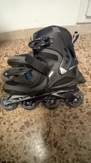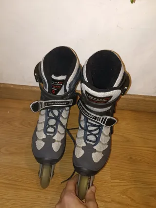 Patines en línea marca Rollerblade, talla 44. Diseñados para patinaje. Muy poco uso. Excemwbte estado. Viene viene cin algunas protecciones. - Color negro y gris. - Cierre de velcro y hebilla.